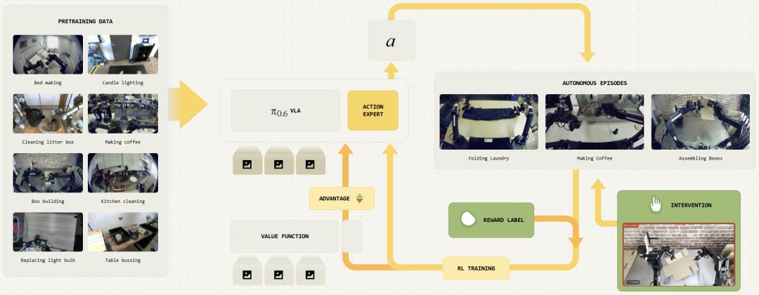 基于这样的思考,Physical Intelligence 开发了一种名为Recap(基于优势条件策略的经验与纠错强化学习)的方法,它实现了所有三个步骤:通过演示训练机器人、通过纠错指导机器人,并使其能够从自主经验中改进。作者使用 Recap 改进了最新版本的视觉 - 语言 - 动作 (VLA) 模型 π(0.6),使其能够稳健高效地执行复杂任务,例如制作意式浓缩咖啡、组装纸箱和折叠各种衣物。