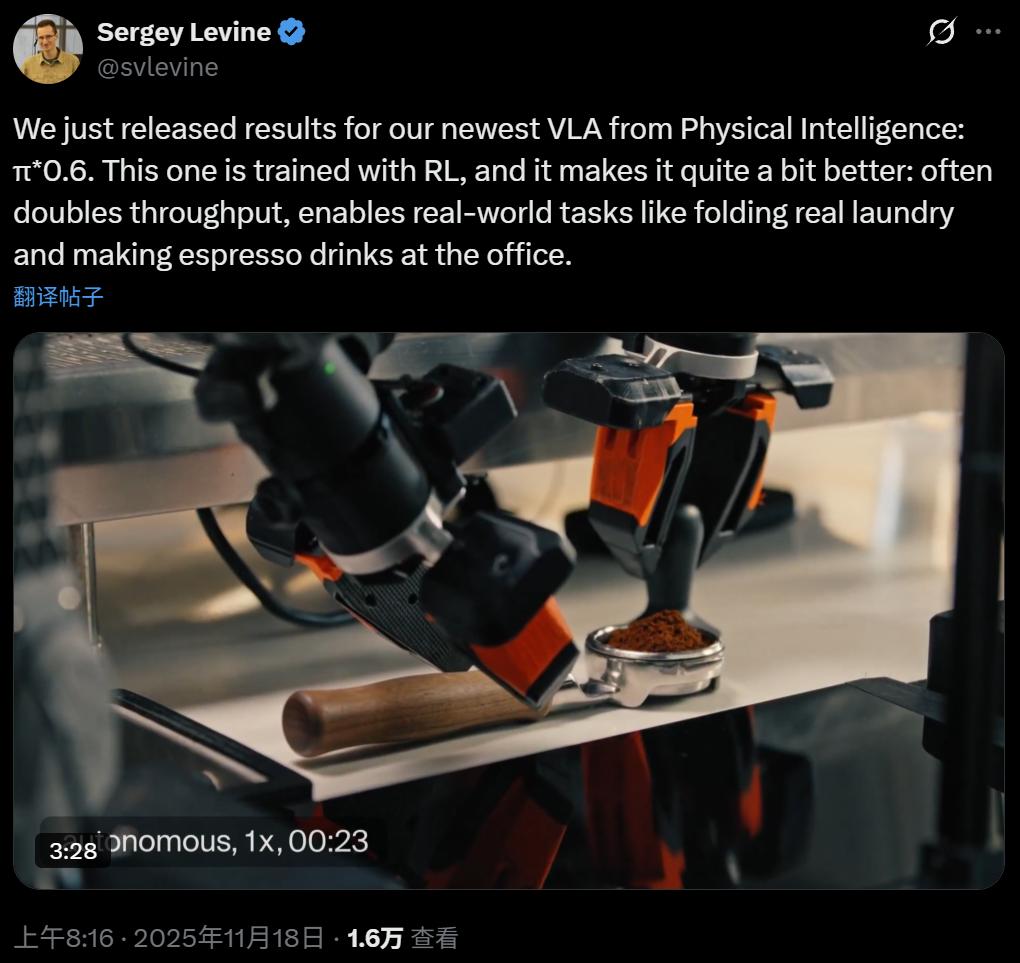 机器学习与决策控制领域的知名专家、UC Berkeley 副教授、Physical Intelligence 联合创始人 Sergey Levine 表示,搭载这个模型的机器人已经可以在公司的办公室里为人们制作拿铁、美式和意式咖啡了。
