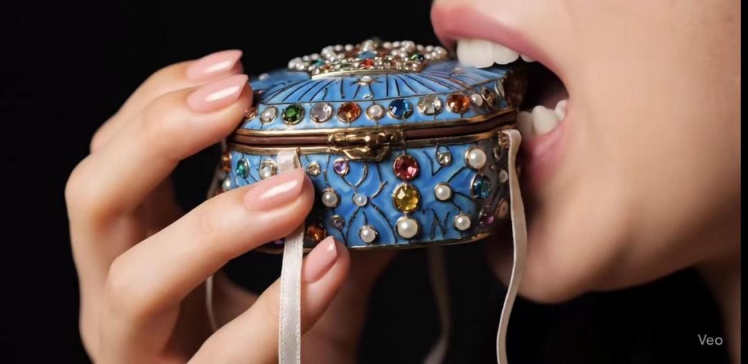 被咬开时发出清脆声响的玻璃水果、镶嵌着宝石的首饰盒、播放着音乐的水晶球,甚至还有毛绒玩具labubu和金条……各种你能想到或者想不到的,都正成为AI吃播的“食材”,被AI主播们塞入嘴里,轻松咀嚼。