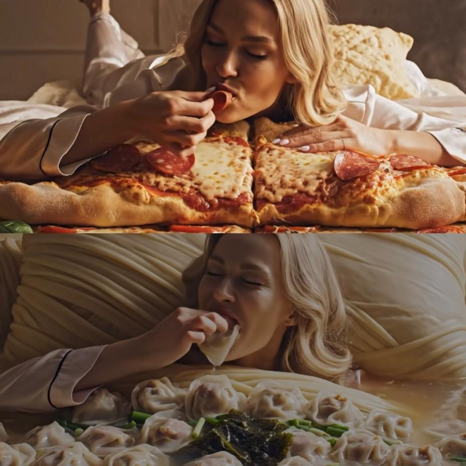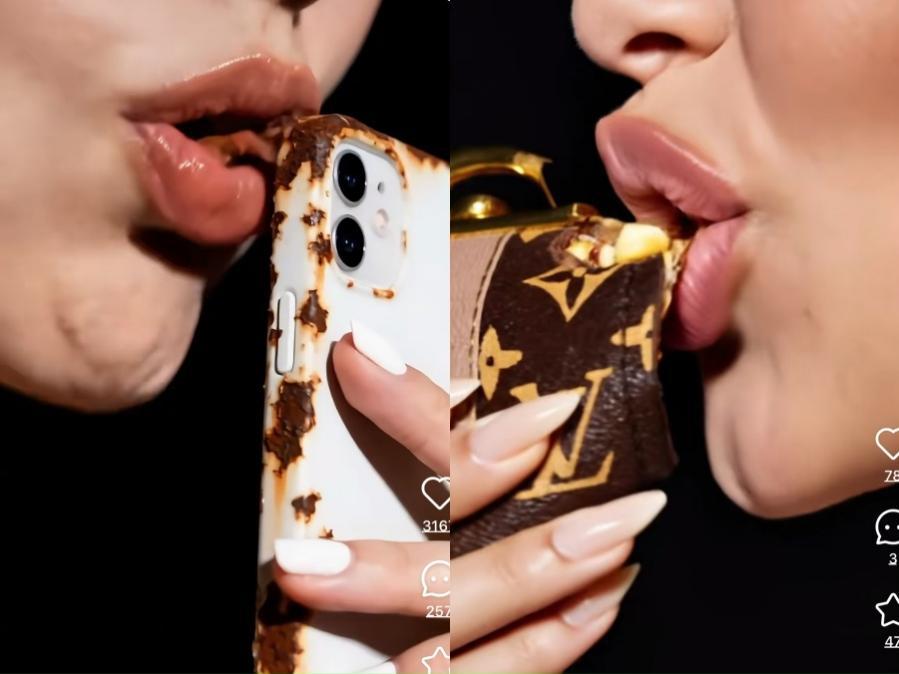 在各大短视频平台和社交平台,这类AI吃播、AI ASMR账号更新的视频里,你能看到各式各样,能想到的或不能想到的食物。最常见的有各种泛着荧光色泽,果冻质地的玩偶、水果或蔬菜,或是钻石和水晶材质的汉堡和蛋糕,进阶一点,则从生锈的手机和机械表,到LV的钱包,再到粉底液、口红和眼影。甚至还有用披萨、火锅等做成一张大床,主播躺入,把食物吃掉。