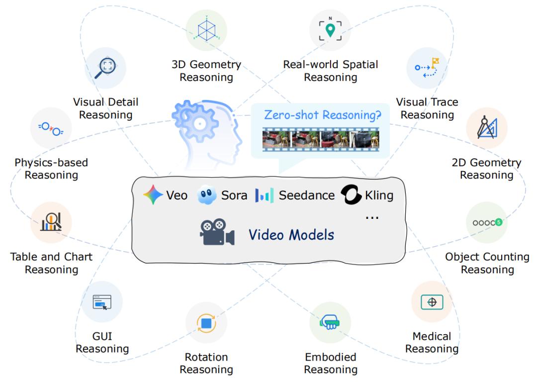 为探究这一问题,来自香港中文大学、北京大学、东北大学的研究团队进行了系统性研究,对 Veo 3 等模型的零样本推理潜力进行了深入评估,并提出了涵盖空间、几何、物理、时间等 12 个推理维度的综合测试基准 ——MME-CoF。