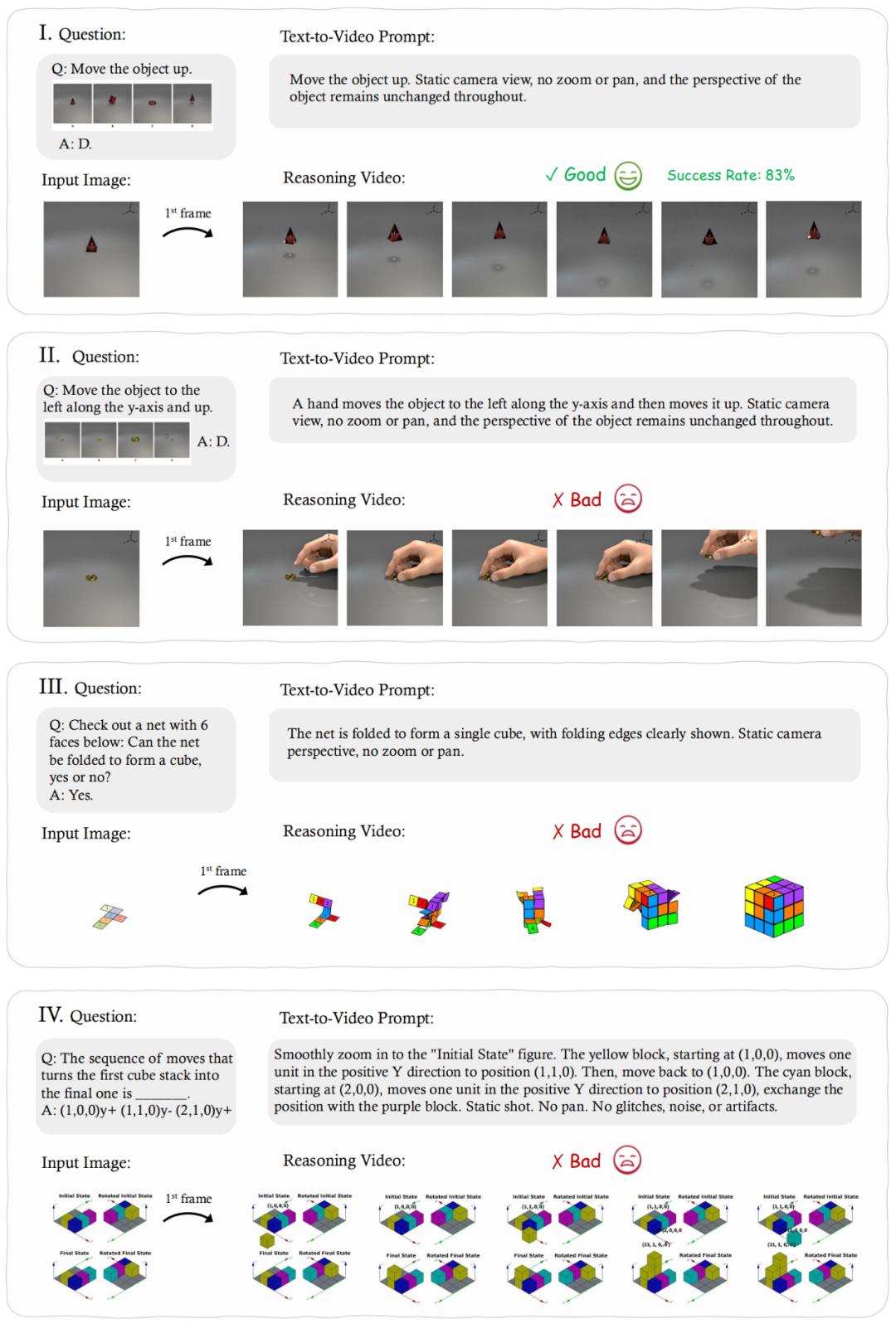 提示式设计创新:将抽象推理任务(如物理、几何、计数)转化为可视化视频生成挑战,迫使模型通过 “帧链推理” 展现过程性思考。