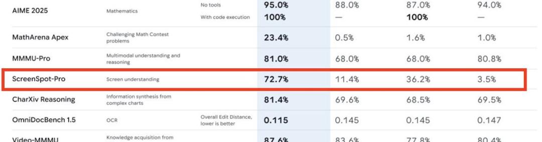 MMMU-Pro的81.0%,CharXiv Reasoning的81.4%都超越了对手。而在理解截图的测试ScreenSpot-Pro的72.7%中,Gemini 3的得分是Claude Sonnet 4.5的两倍,GPT-5.1的二十倍。这对于构建能够真正理解和操作图形界面的AI代理至关重要。