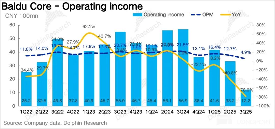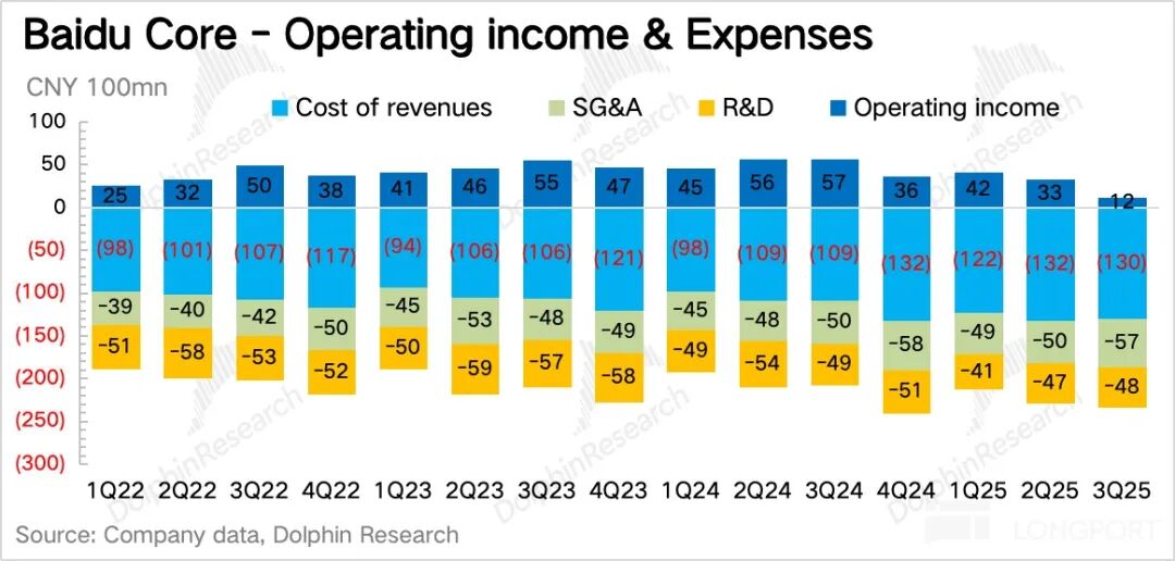 4. 核心利润率压力释放:百度核心的主业经营利润,也就是毛利润减掉三项经营费用,Q3 下降到了 12 亿,利润率仅 5%,远低于正常时期水平。这与多个因素相关: