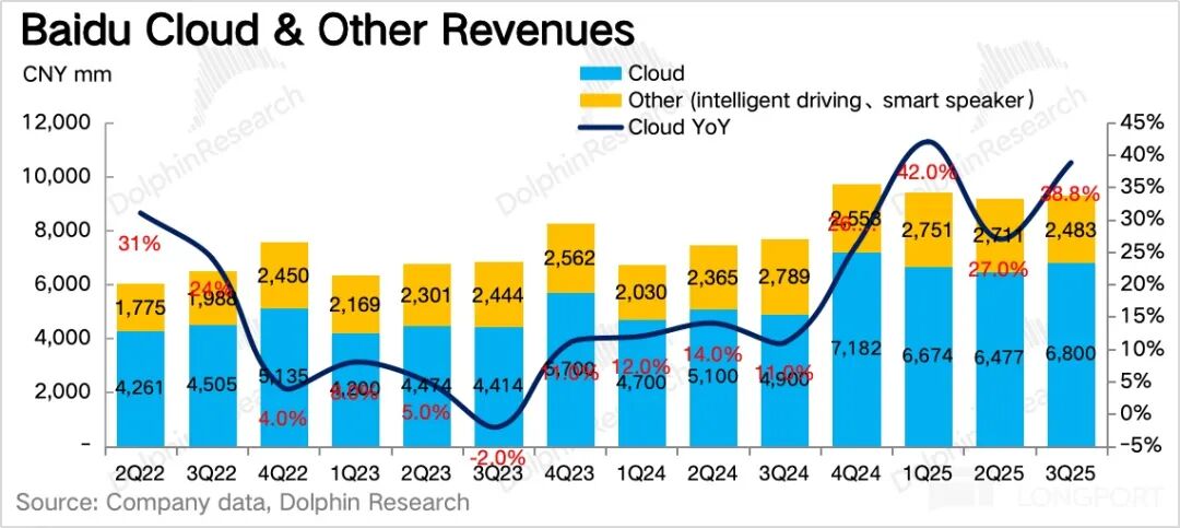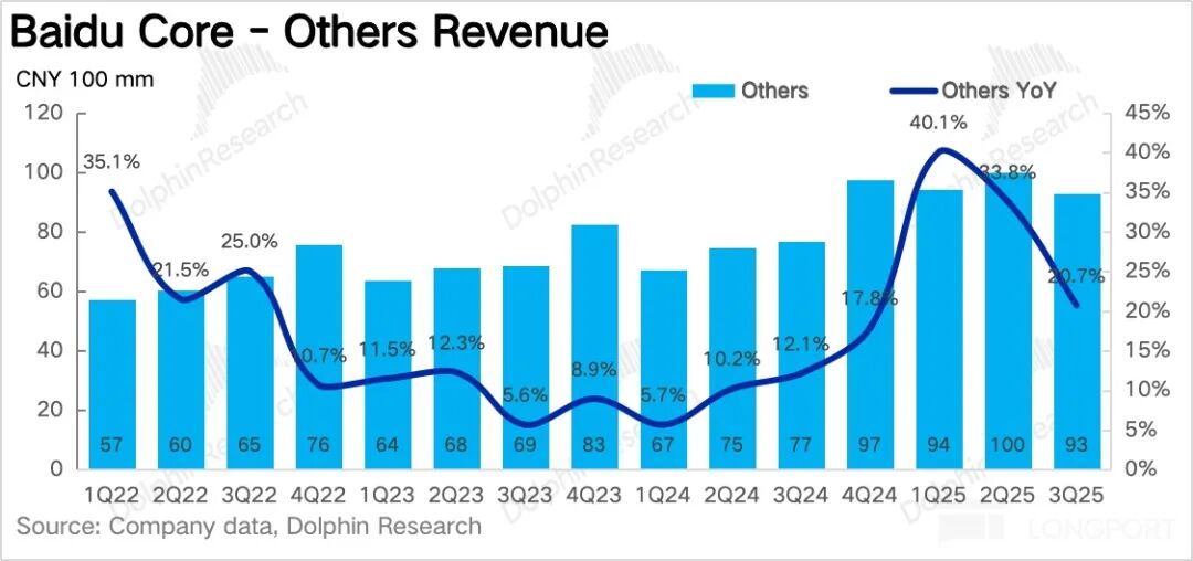 (2)AI 应用 26 亿,同比增速 6%,主要包括百度文库、百度网盘、数字员工等。尽管也是隶属于 AI+,但增速较低,海豚君预计主要是百度网盘(本季度促销减免)以及其他杂项的拖累。但同时也不得忽视竞争的潜在影响,比如夸克、微信网盘近期都有功能或服务的提升。