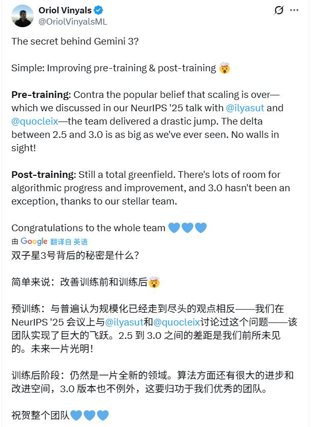 在Gemini 3发布后,谷歌DeepMind副总裁奥里奥直言:这并非简单的规模扩张,而是围绕预训练、后训练的协同进化。Gemini 2.5与Gemini 3之间存在着巨大差距,看不到天花板。