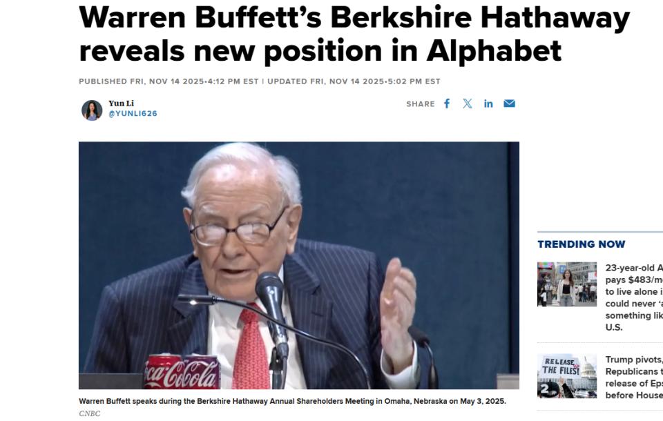 如今,Alphabet已成为今年表现最佳的大型科技股。上周,沃伦·巴菲特旗下伯克希尔·哈撒韦公司披露已建仓该公司。