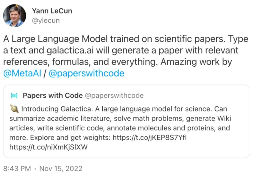 证据如下,2022年11月,LeCun仍在高声宣扬(其公司的)LLMs是「了不起的成果」: