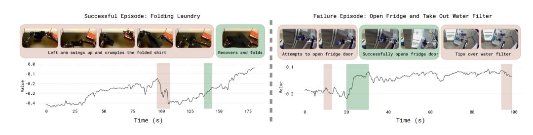 举例来说,在折叠衣服任务中(左图),红色区域表示机器人突然将衣服拉起的错误动作,对应价值下降;而绿色区域表示机器人正确完成折叠时,价值上升。