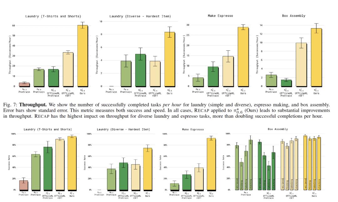 在最难的任务(如折叠多样化衣物和制作咖啡)中,RECAP将任务的吞吐量(每小时成功次数)提高了一倍以上,相比于仅进行监督微调(SFT)的模型,RECAP将任务失败率降低了约2倍。