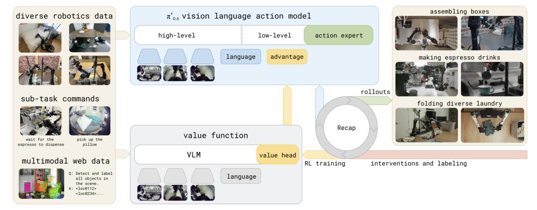 RECAP让VLA能够使用奖励反馈和人类介入进行训练,其主要包含三个阶段: