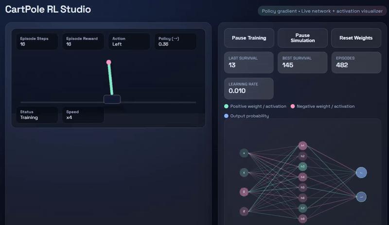 用户不仅可以观看倒立摆的动态,还能通过内置的策略梯度控制器直接训练模型,让AI在实验中不断优化策略。