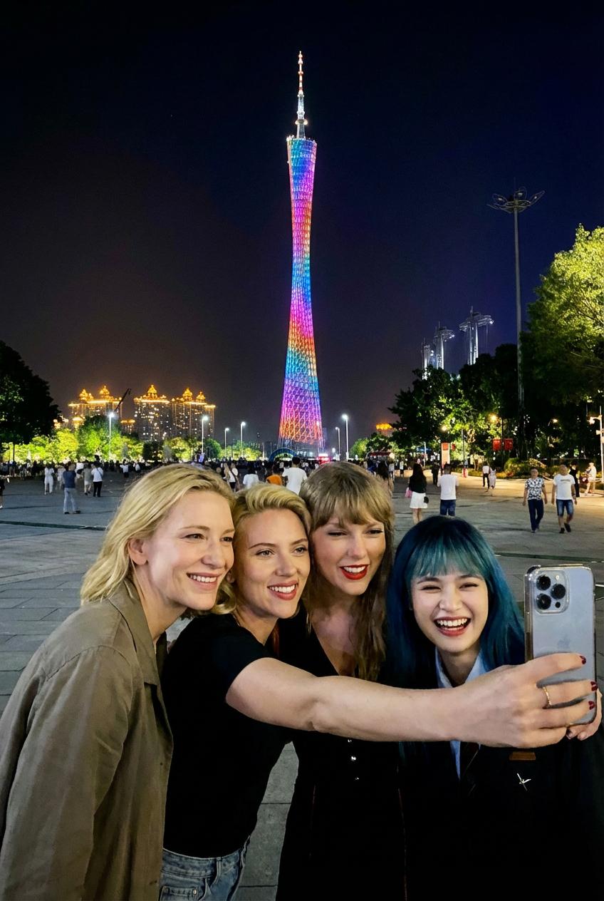 提示词:将这四个人放在一张图像中。她们看起来像是一张自拍,看起来像是随兴而为。背景图片是最后一张,她们在这里开心地与地标建筑合影留念。整体的图片颜色和光线看起来都很自然,她们看起来自然地来到这里旅行。