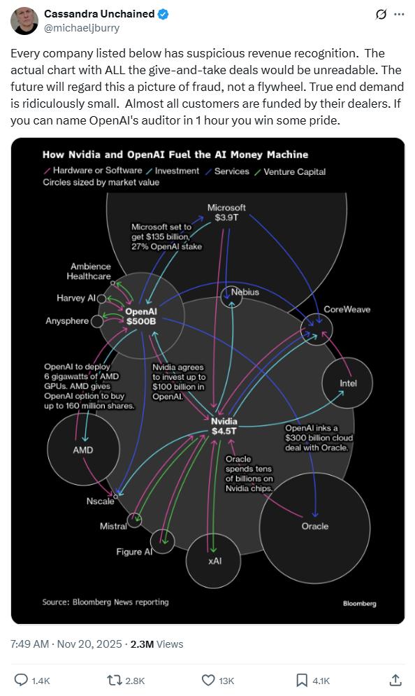 2025年11月18日,即英伟达财报发布前两天,SEC公司金融部向三家云基础设施公司发送了意见函,要求其就云信用额度安排的收入确认政策提供额外披露。尽管SEC未证实其关联性,但这些请求的时机和具体性与对循环融资的担忧相符。