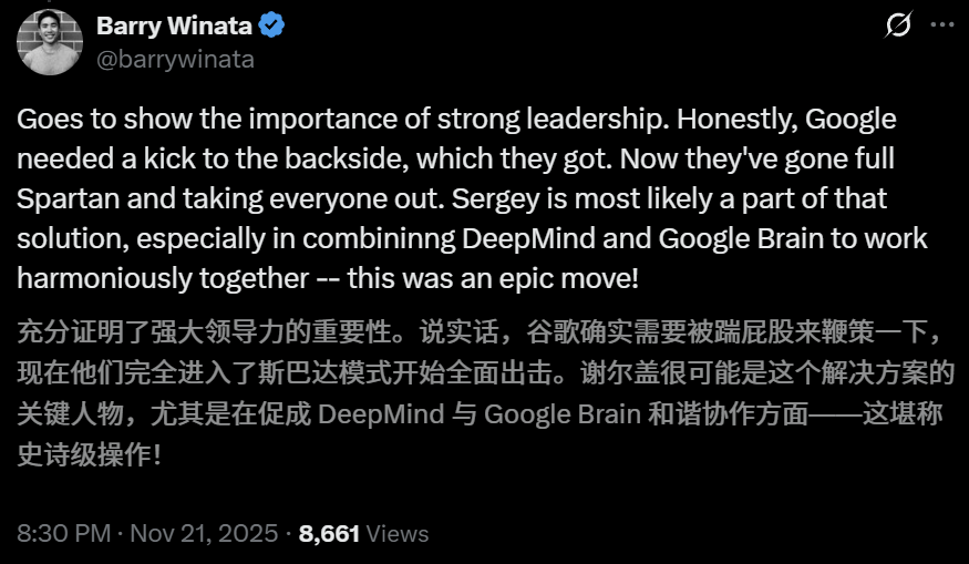 甚至有网友认为,如果不是创始人打通了谷歌部门之间的壁垒,Gemini 3或者Nano Banana Pro并不会以「全面出击」的方式上线。