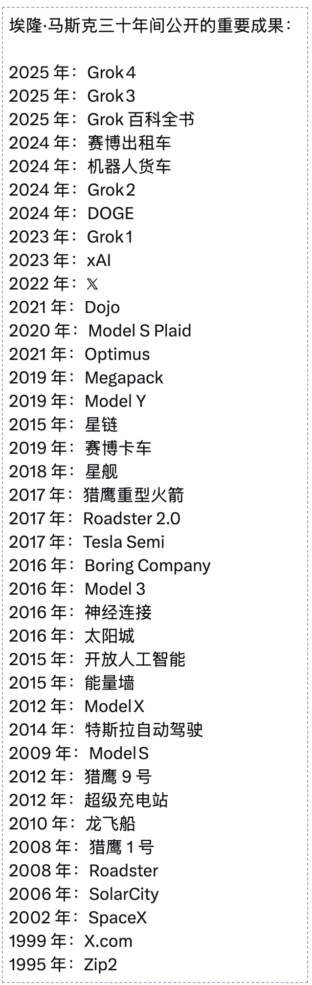 马斯克这波不是无的放矢,网友们放出了马斯克这近三十年的公开成果,以此来说明他夸口后往往都能实现。
