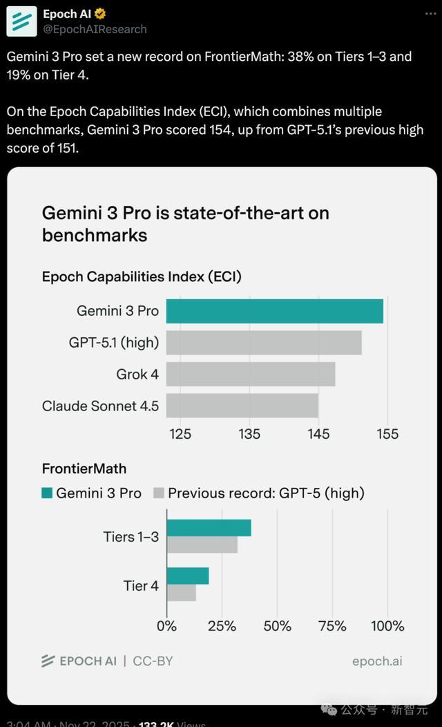 在综合多项基准测试的Epoch能力指数(ECI)中,Gemini 3 Pro获得154分,超越了GPT-5.1此前保持的151分的最高纪录。