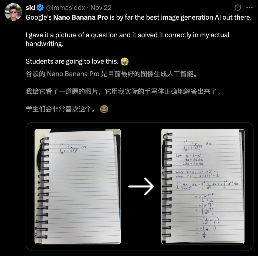 还有网友将一道数学题拍照上传,Nano Banana Pro竟能以同样的手写体输出答案。