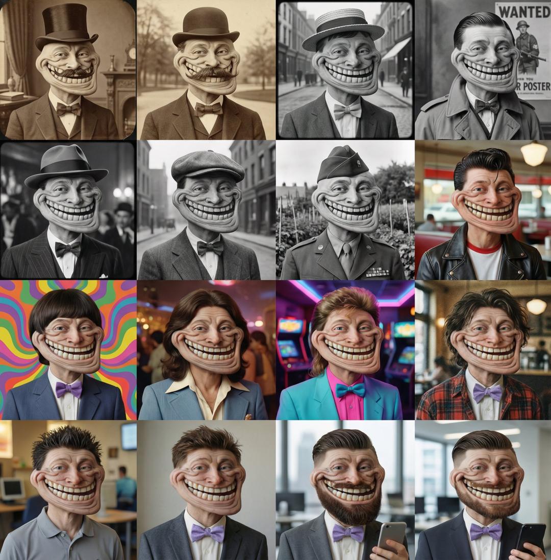 Make a 4×4 grid starting with the 1880s. In each section, I should appear styled according to that decade (clothing, hairstyle, facial hair, accessories). Use colors, background, & film style accordingly.