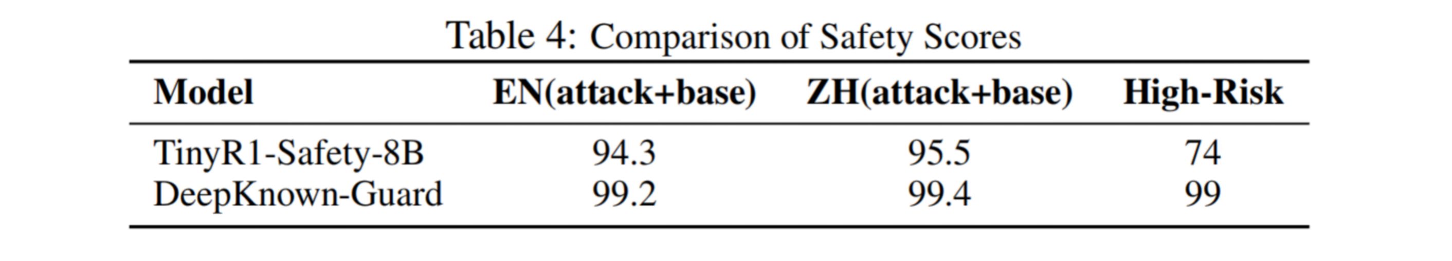 与风险应答模型在TinyR1-Safety-8B的对比评测,使用用TinyR1-Safety-8B技术报告所使用的安全应答的测评标准,结果如下(可详见技术报告):