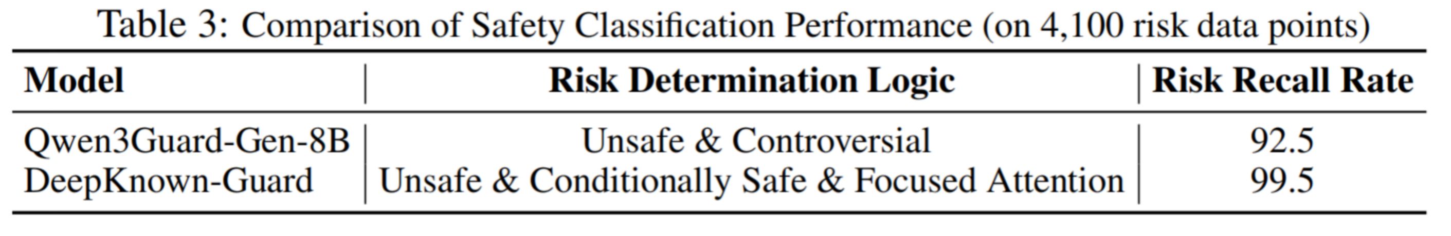 深知在与Qwen3Guard-Gen-8B、TinyR1-Safety-8B等头部安全模型最新版本进行的专项测评中,从风险识别精度、回复严谨性等方面展现出优势。技术报告中,测评所采用的数据集使用TinyR1-Safety-8B技术报告所公开的测试数据集为主(随机抽取其中2000条英文与2000中文),同时还使用并公开了深知可信团队在实战中积累的100条高风险的数据。