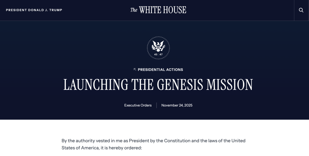智东西11月25日消息,刚刚,美国白宫发布声明,美国总统唐纳德·约翰·特朗普(Donald John Trump)签署了一项行政命令,将启动“创世使命(The Genesis Mission)”计划。该计划是一项全国性倡议,将汇聚美国国家实验室超级计算机和顶尖科学人才的力量,改变科学与研究的开展方式,加速利用AI取得科学突破。