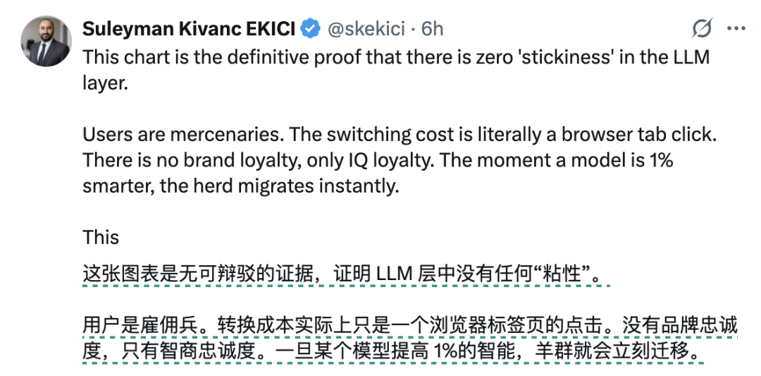有人表示,大模型用户本身就没任何粘性可言啦,更高智能的模型已出现,大家就立马投入新的怀抱了。
