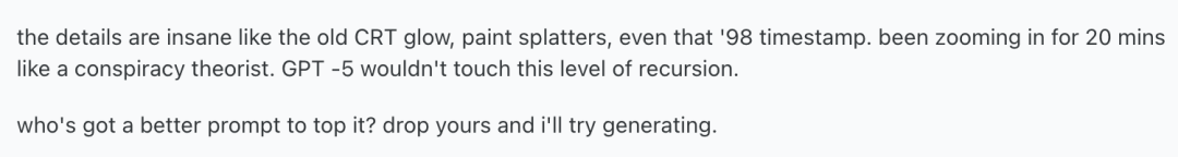 老式显示器发出的光晕,画布下溅上去的颜料,还有画面右下方那个傻瓜相机的时间戳……r/ChatGPT 像欣赏一张传世名画一样把这张图放大看了 20 分钟。