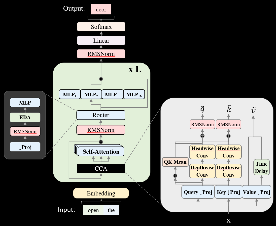 ZAYA1 的优异性能还得益于其在模型架构上的两项关键创新。首先,它采用了新颖的 CCA 注意力机制(Compressive Convolutional Attention),通过在注意力模块内部引入卷积操作,显著降低了计算量和显存占用。