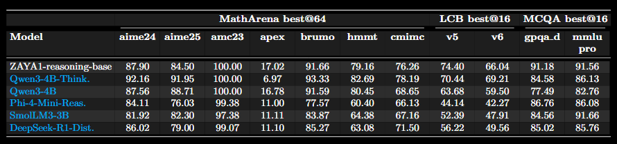 基准测试结果显示,ZAYA1 的综合性能与业界领先的 Qwen3 系列模型不相上下,同时优于 SmolLM3、Phi4 等主流开源模型。特别是在未经特定指令微调的情况下,其推理版本在数学和 STEM 等复杂推理任务上已接近 Qwen3 的专业版本。
