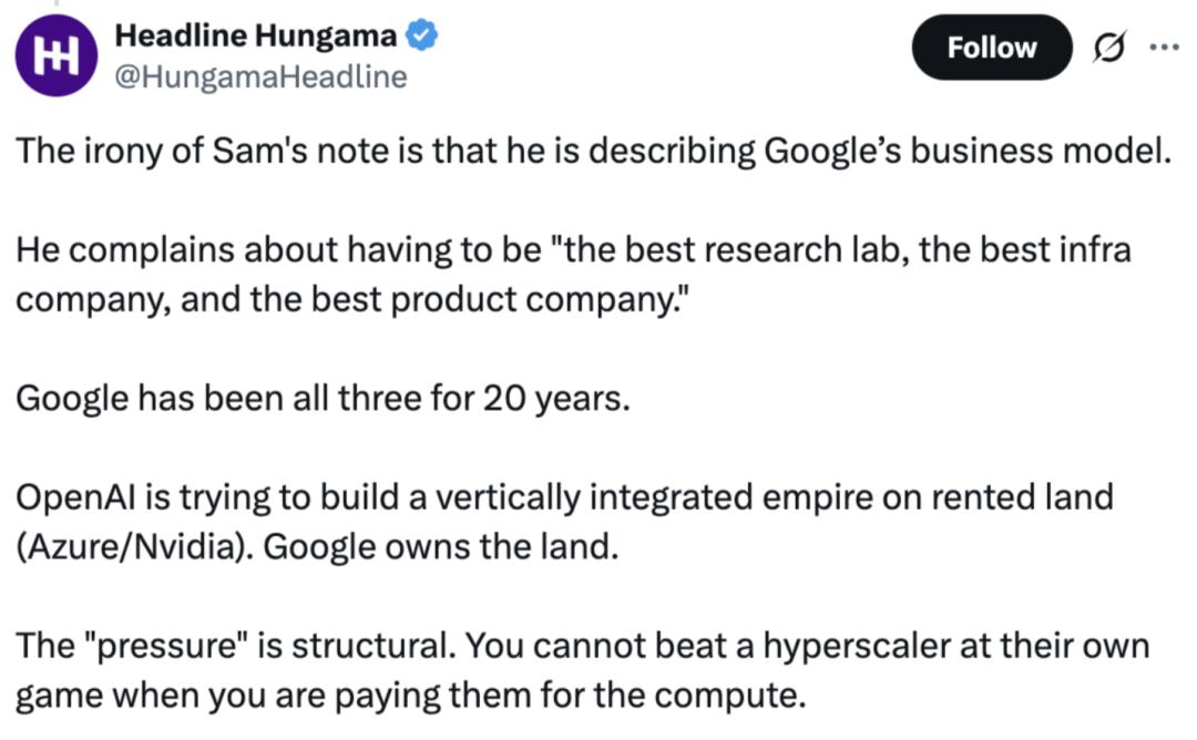 而有意思的是,在 Sam Altman 的备忘录被报道出来后,针对他对 OpenAI 的未来憧憬,有网友「锐评」:他说必须要让 OpenAI 成为「最好的研究实验室、最好的基础设施公司和最好的产品公司」,但这不就是谷歌的商业模式吗?谷歌在过去 20 年里一直都是这三者兼备……