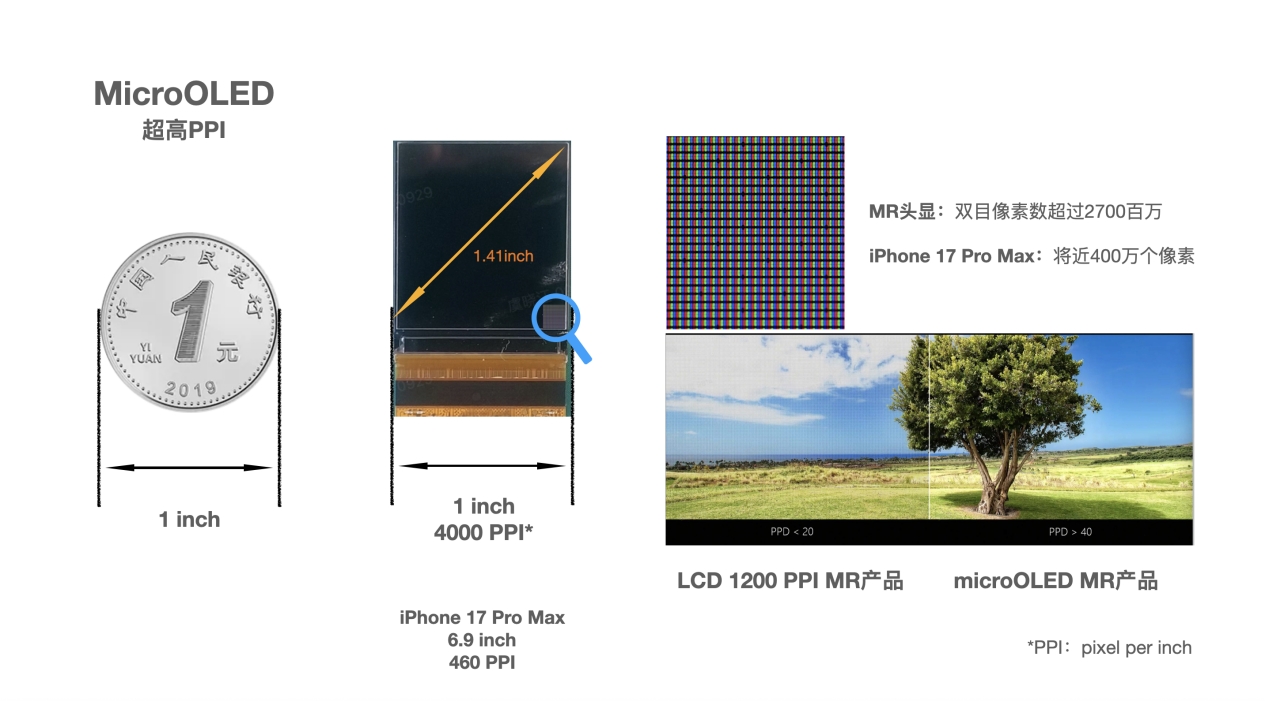 如果我们去对比iPhone,iPhone 17 Pro Max 是 6.9 英寸的,它的PPI是460。我们在 2022 年定制 MicroOLED 的目标是什么呢?我们要做到近4000PPI,大概是iPhone 17接近九倍的量级,所以这个事情的挑战是非常大的。