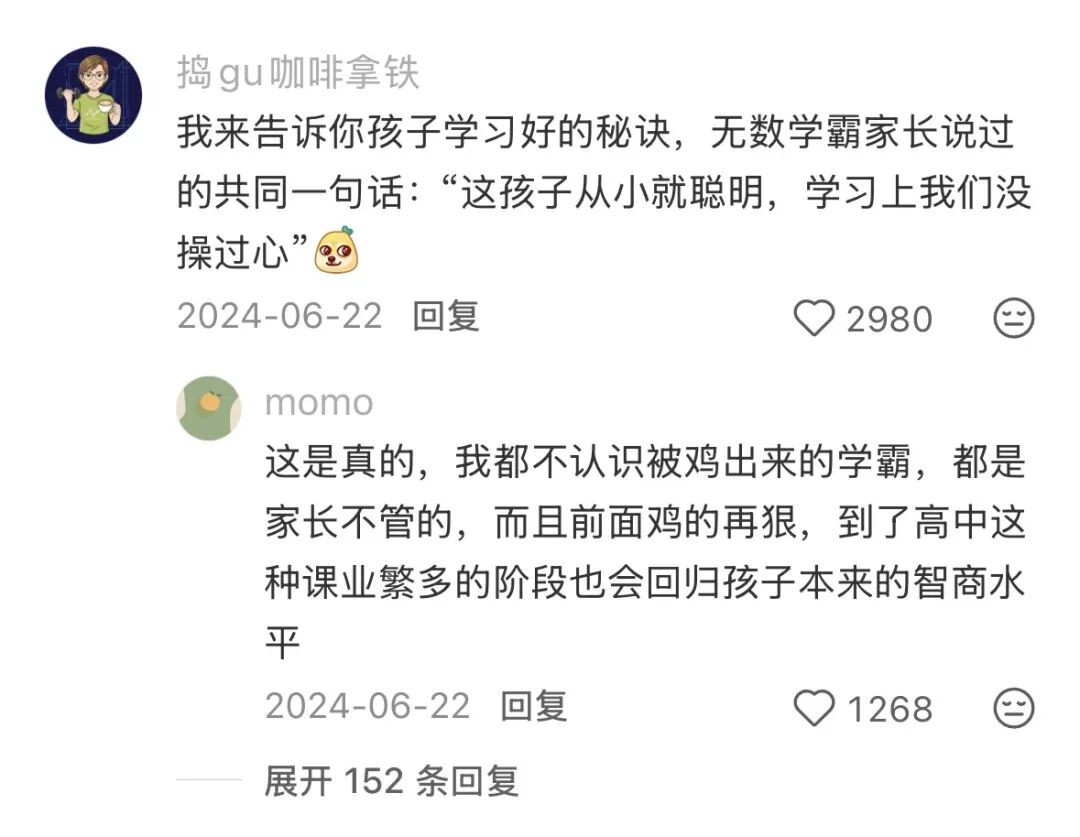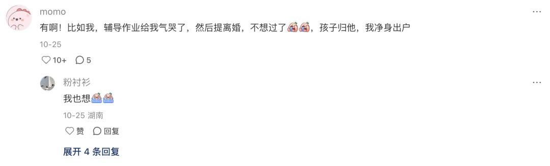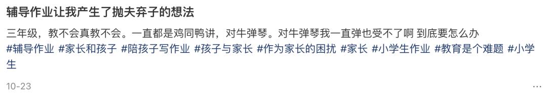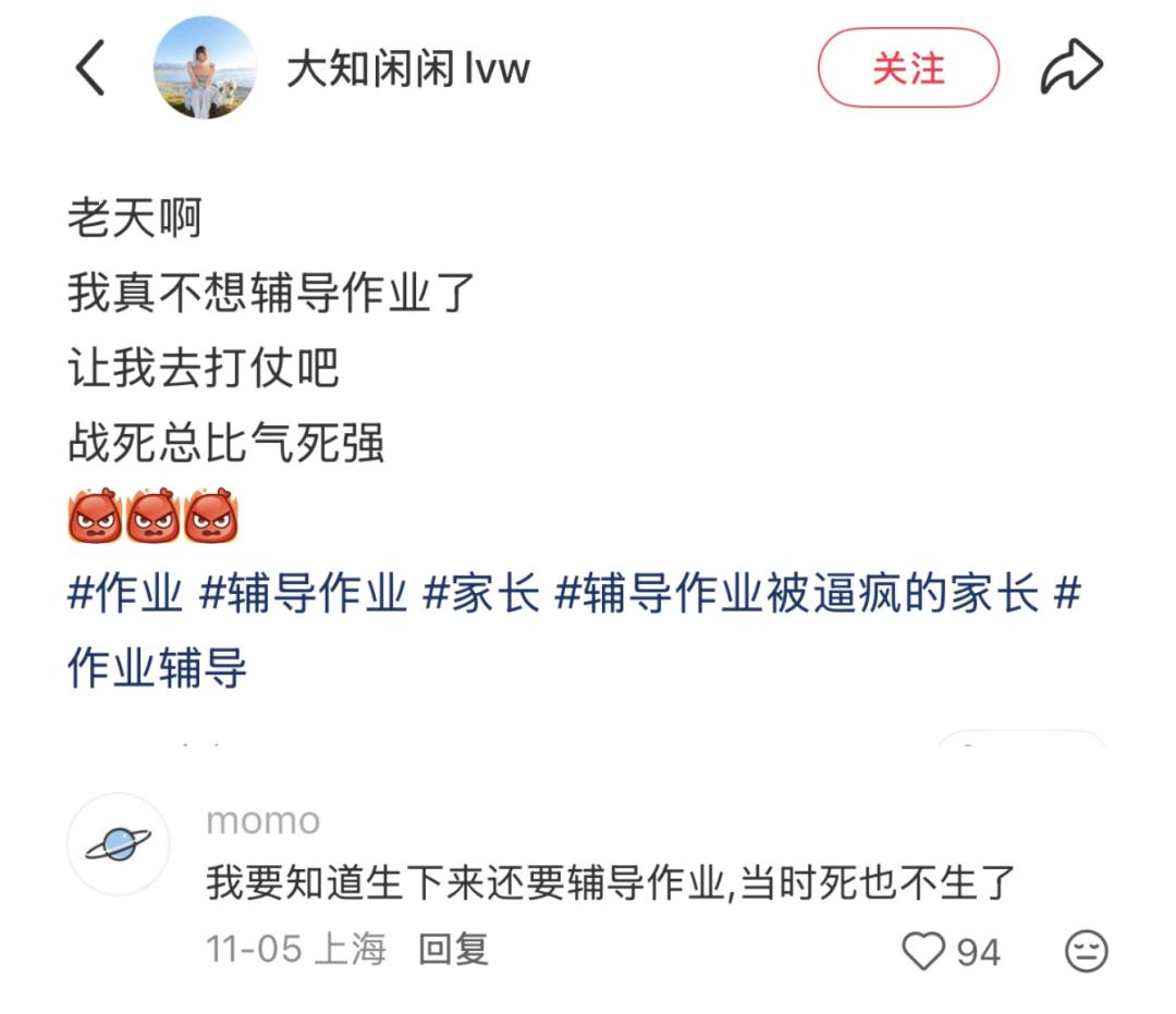 一位小红书网友创建了一个叫《妇愁者联盟》的群聊,里面都是崩溃的小学学渣家长;另一位网友建议把辅导作业列入满清十大酷刑,“整场下来喝五十次水,上三十次厕所,平均一分钟掉一次笔,两分钟使用橡皮擦一次”“我大概十分钟发小火一次,半小时彻底疯一次”。