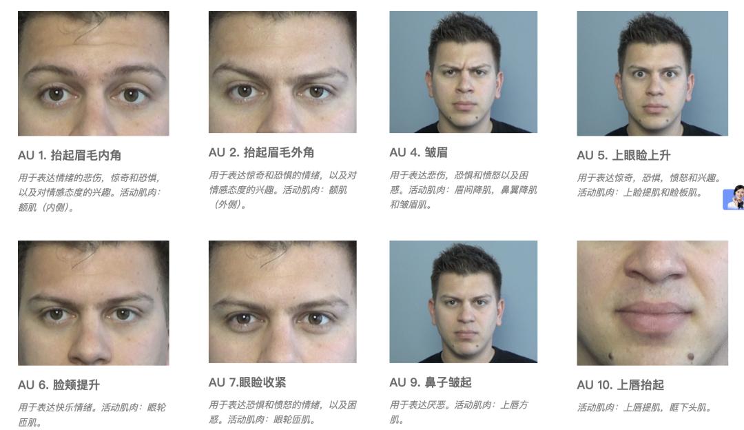 把这些基础动作组合起来,就可以得到不同的情绪,比如AU1-2-4(抬起眉毛内角+抬起眉毛外角+皱眉)对应的是恐惧,AU4-5(皱眉+上眼睑上升)对应的是愤怒。