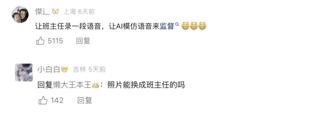 没娃的网友忙着幸灾乐祸。一方有难八方添乱,他们为AI家教贡献了更加歹毒的使用方法——克隆班主任的声音,让孩子在家也能体会到校园的温馨。