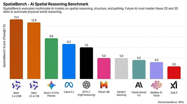 SpatialBench榜单显示,Qwen3-VL-235B和Qwen2.5-VL-72B分别斩获13.5和12.9分,领先于Gemini 3.0 Pro Preview(9.6) 、GPT-5.1(7.5)、Claude Sonnet 4.5等海外顶尖模型。