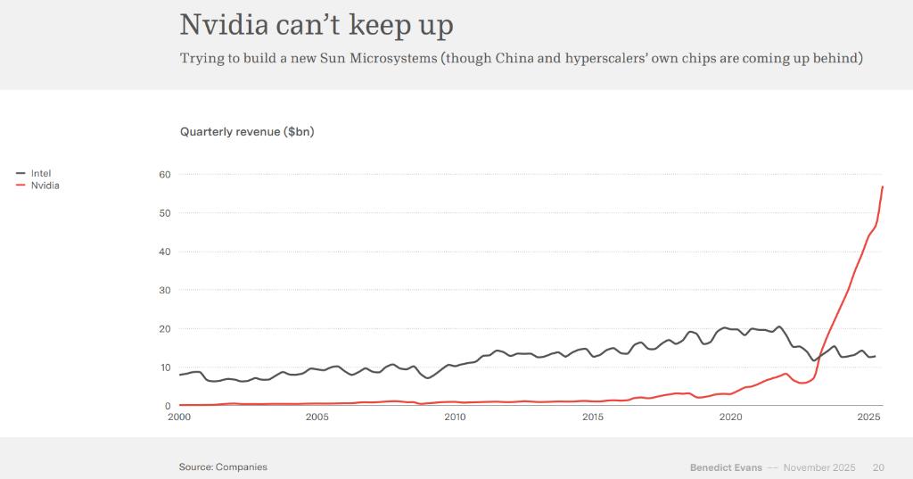美国数据中心建设正在超越办公楼建设规模,成为新的投资周期驱动力。英伟达因无法跟上需求而面临供应瓶颈,其季度收入已超越英特尔多年的积累。台积电同样无法或不愿足够快速地扩张产能以满足英伟达的订单需求。