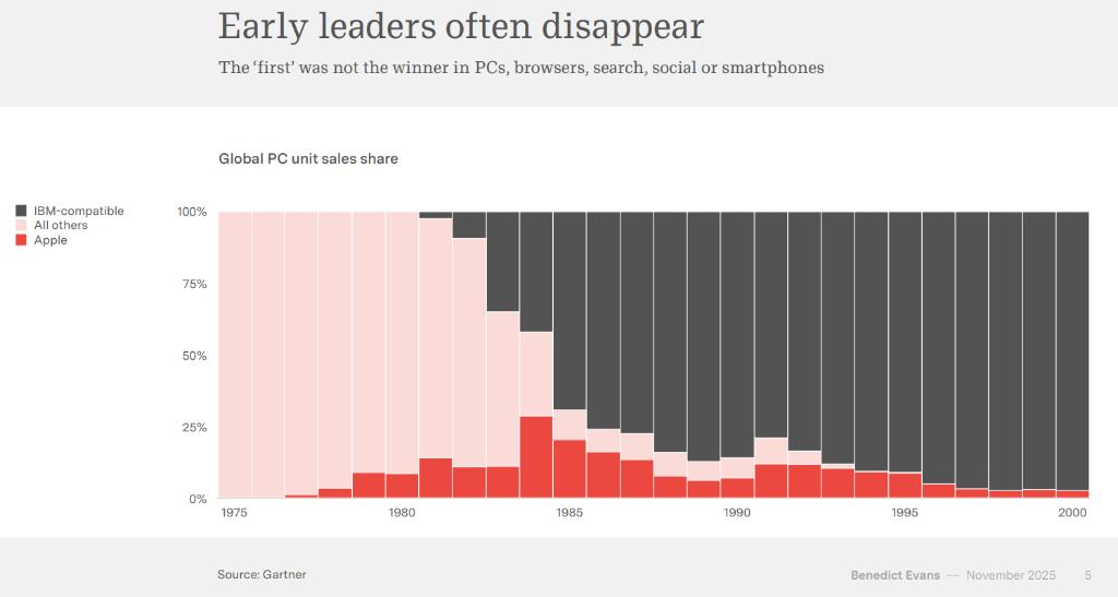 数据显示,微软操作系统在全球计算机销售中的份额从2010年前后的高点急剧下滑,到2025年已降至不足20%。类似地,在个人电脑市场早期占据主导地位的苹果也曾被IBM兼容机边缘化。Evans强调,早期领导者往往会消失,这似乎是平台转移的铁律。