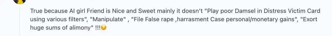 ●一个来自r/MensRights的用户在关于AI女友报告的帖子下评论(内容:真的,因为AI女友都很好很可爱,主要是因为她们不会“打一张可怜的落难少女的受害者牌”,说各种“操纵”、“提交虚假强奸、骚扰案件”、“巨额赡养费”等)
