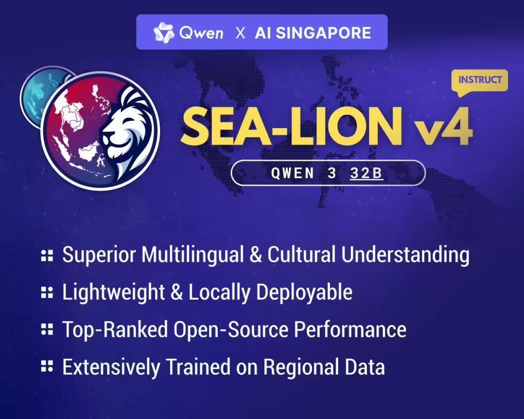 据阿里云官方公众号,新加坡国家人工智能计划近日发布了一款名为 Qwen-SEA-LION-v4 的东南亚多语言大模型。该模型的核心技术底座基于阿里巴巴的“通义千问”开源模型构建。