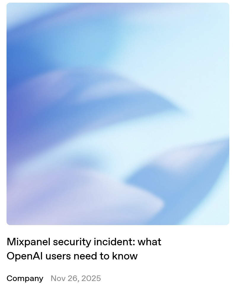 OpenAI 表示,攻击 Mixpanel 的黑客可能已获取了部分 OpenAI 用户的账户名称、关联电子邮箱、大致位置信息、访问所用操作系统与浏览器、推荐网站、相关组织或用户 ID。但聊天记录、API 请求、API 使用数据、密码、凭证、API 密钥、支付详情或政府颁发的身份信息均未泄露或受到损害。