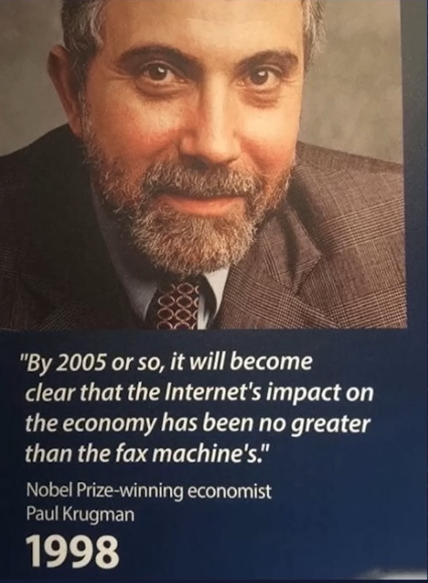 首先,人工智能带来的变革是切实存在的,而且就在我们说话的当下仍在不断推进。不要像Paul Krugman那样——1998年,他曾将互联网的影响力比作传真机,严重低估了互联网的变革力量。我们同样不能低估AI带来的变化。