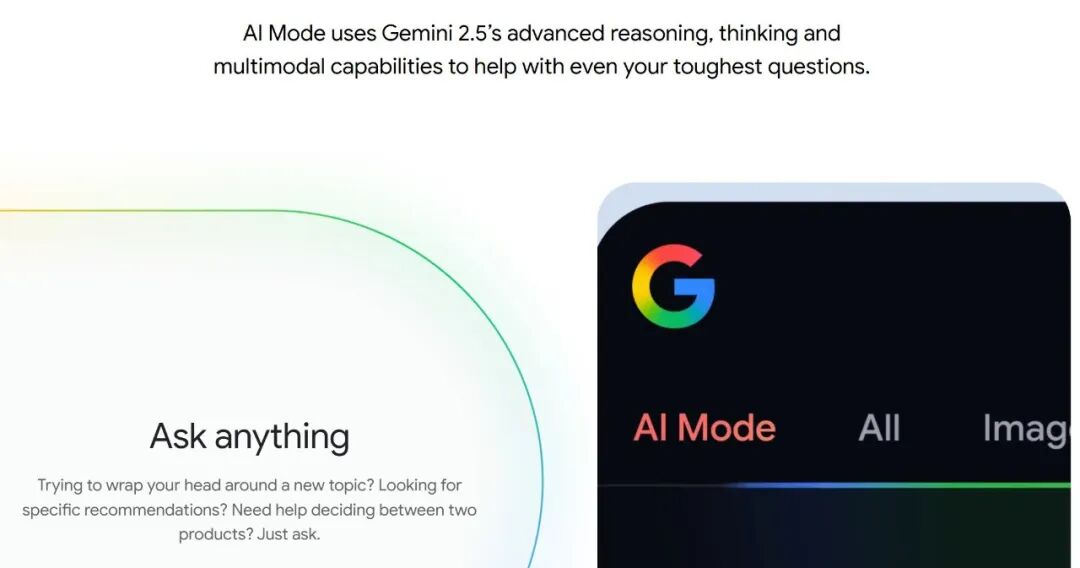 Robby:AI模式是搜索体验的下一个阶段,它整合了三大能力:AI概览、多模态搜索和对话模式。AI概览就是页面顶部的快速回答。多模态能力允许用户通过图像或语音搜索。最后是对话模式,它在最先进的模型上创造了一种端到端的前沿搜索体验,真正让你可以问谷歌搜索的任何问题,你可以像聊天一样与谷歌来回对话交流。
