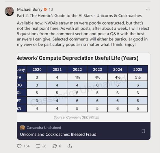 Burry的主要关切之一是AI公司如何进行折旧会计处理——即企业预计资产价值下降的速度,以及资产在其使用寿命结束时的残余价值。