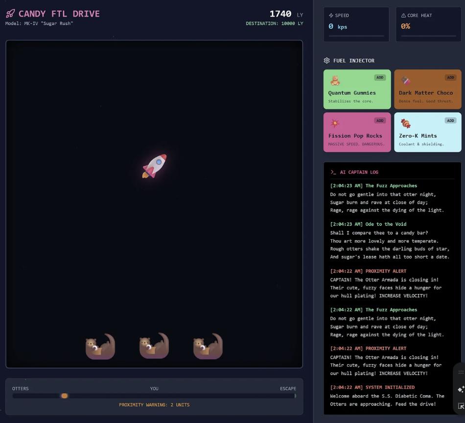 Gemini并没有满足仅用文字来回答,还「现身说法」做出了一个小游戏:玩家要用糖果的力量逃离水獭,过程中还有不断弹出的有趣更新。