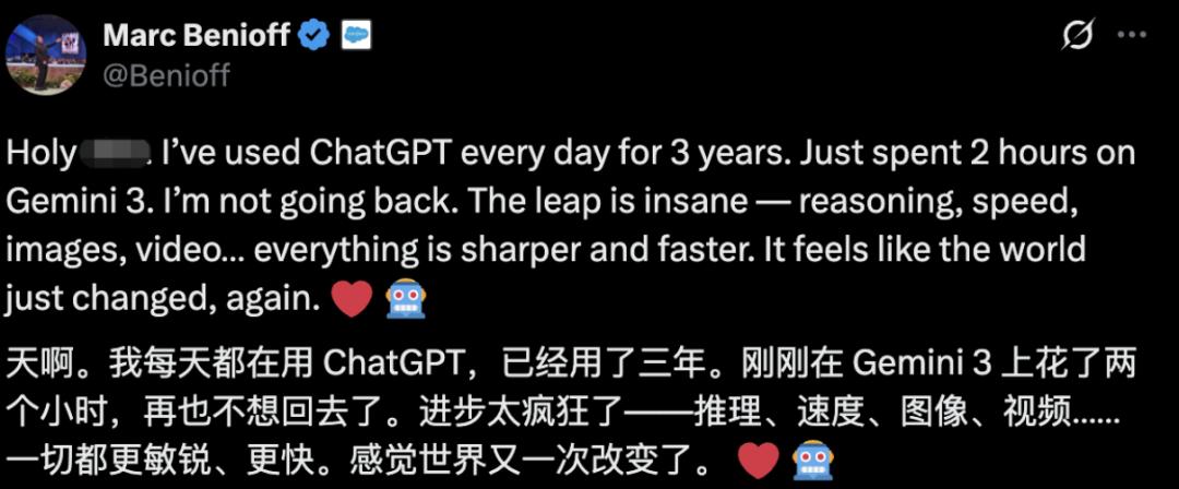 不止是Benioff,包括奥特曼、马斯克在内的诸多科技圈大佬都对Gemini 3的表现赞誉有加。