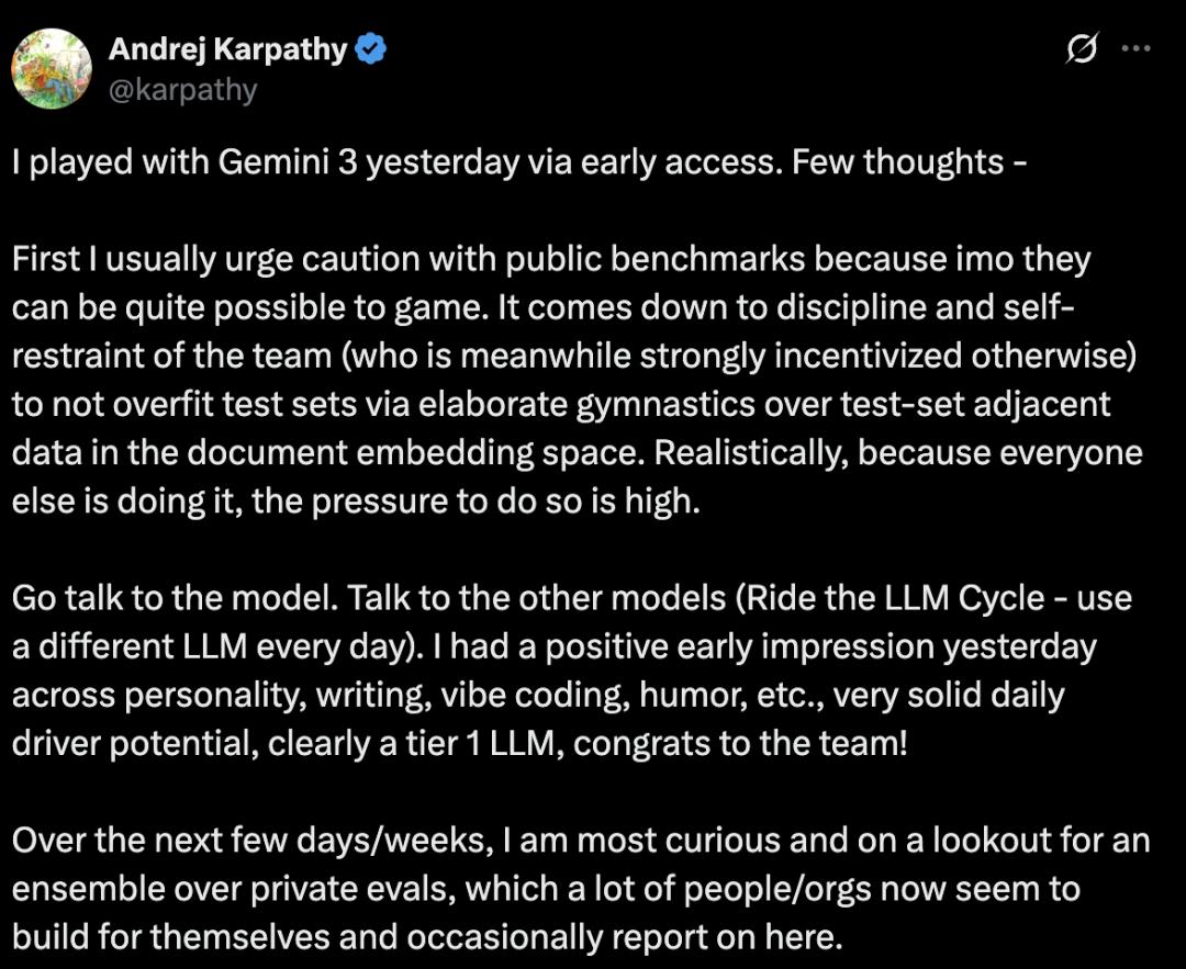 OpenAI创始团队成员、前特斯拉AI总监Andrej Karpathy也在X平台上表示,亲测过后,他对Gemini 3的早期印象非常好。