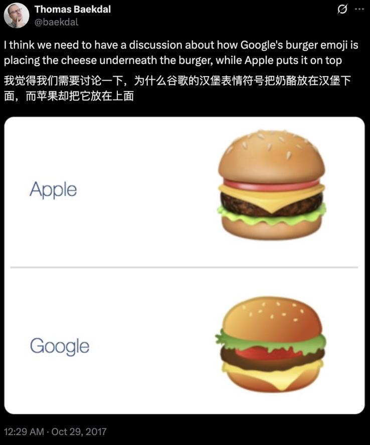 网友Thomas Baekdal在推文中表示谷歌的汉堡表情符号把奶酪放在了牛肉的下面(正确的位置应该在上面)。