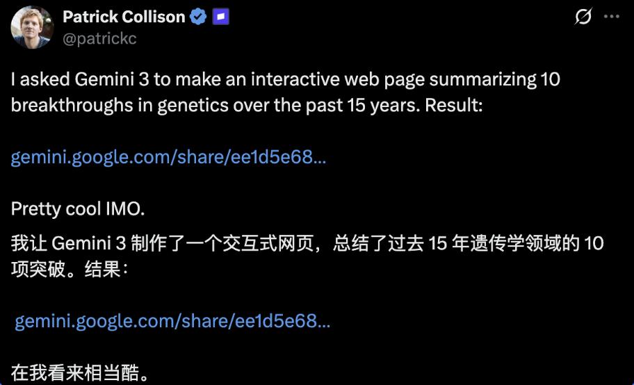 Stripe CEO Patrick Collison使用Gemini 3生成了一个互动网页,他的评价是「相当酷」。