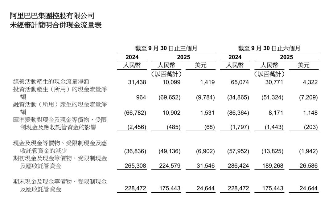 财报显示,本季度,阿里巴巴里经营活动产生的现金流量净额为100.99亿元,相较2024 年同期的人民币314.38亿元下降68%。